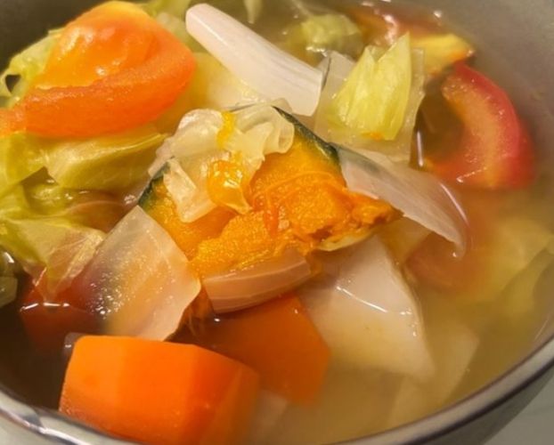 - 綠葉登場:等根莖類軟了(用筷子能輕鬆戳過蘿蔔),就可以把高麗菜、番茄塊丟下去。再煮個10分鐘左右,讓高麗菜軟化,番茄煮出味道。