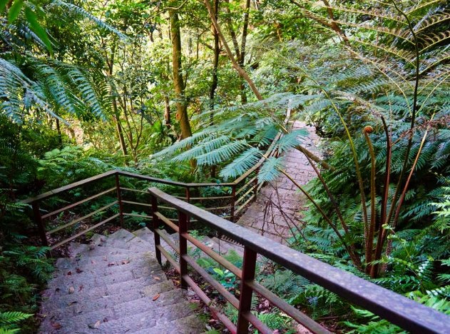 • 步道兩旁植被豐富,仔細觀察,各種蕨類、姑婆芋、野花野草生意盎然。春秋兩季來,生態展示館附近的櫻花油桐花更是點綴得恰到好處。